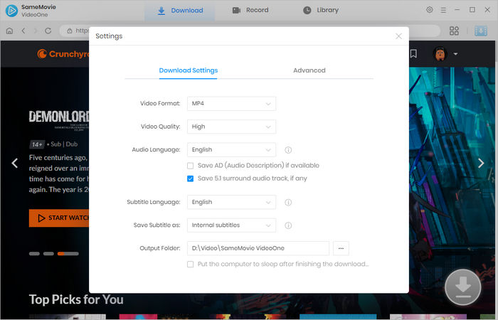 Run SameMovie Video One on your computer and select the Crunchyroll or HIDIVE website. It currently supports downloading from Crunchyroll and HIDIVE. To download anime from other websites, you need to use the record feature. (Check how to record dubbed anime for free)